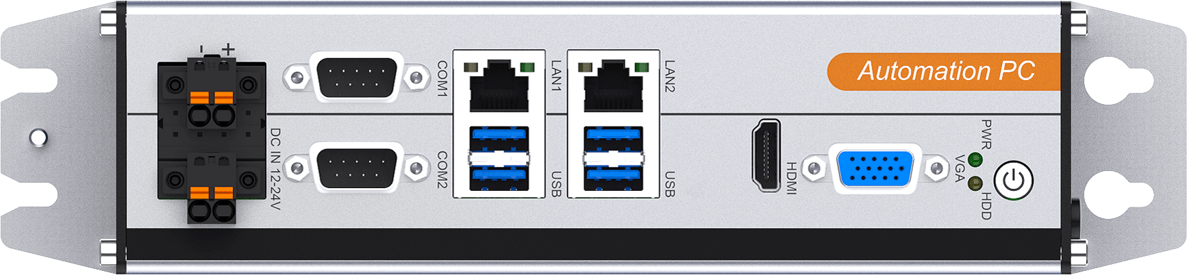 VGA at 1920×1200 and HDMI at 4K 60Hz. Run two displays simultaneously for a HMI panel plus status screen.