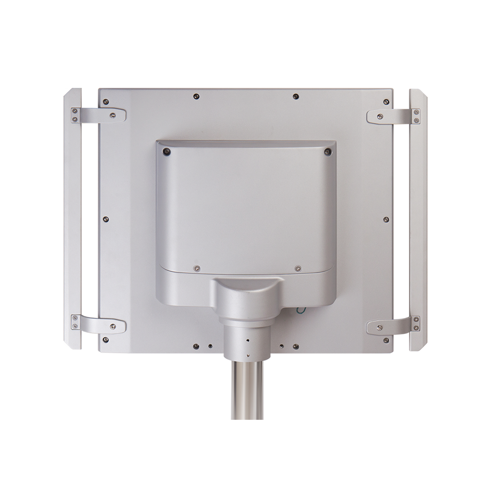 The enclosure is full IP65, front and rear sealed against dust and water. The swing arm mounts from the top or bottom rail and positions the screen where the operator needs it.