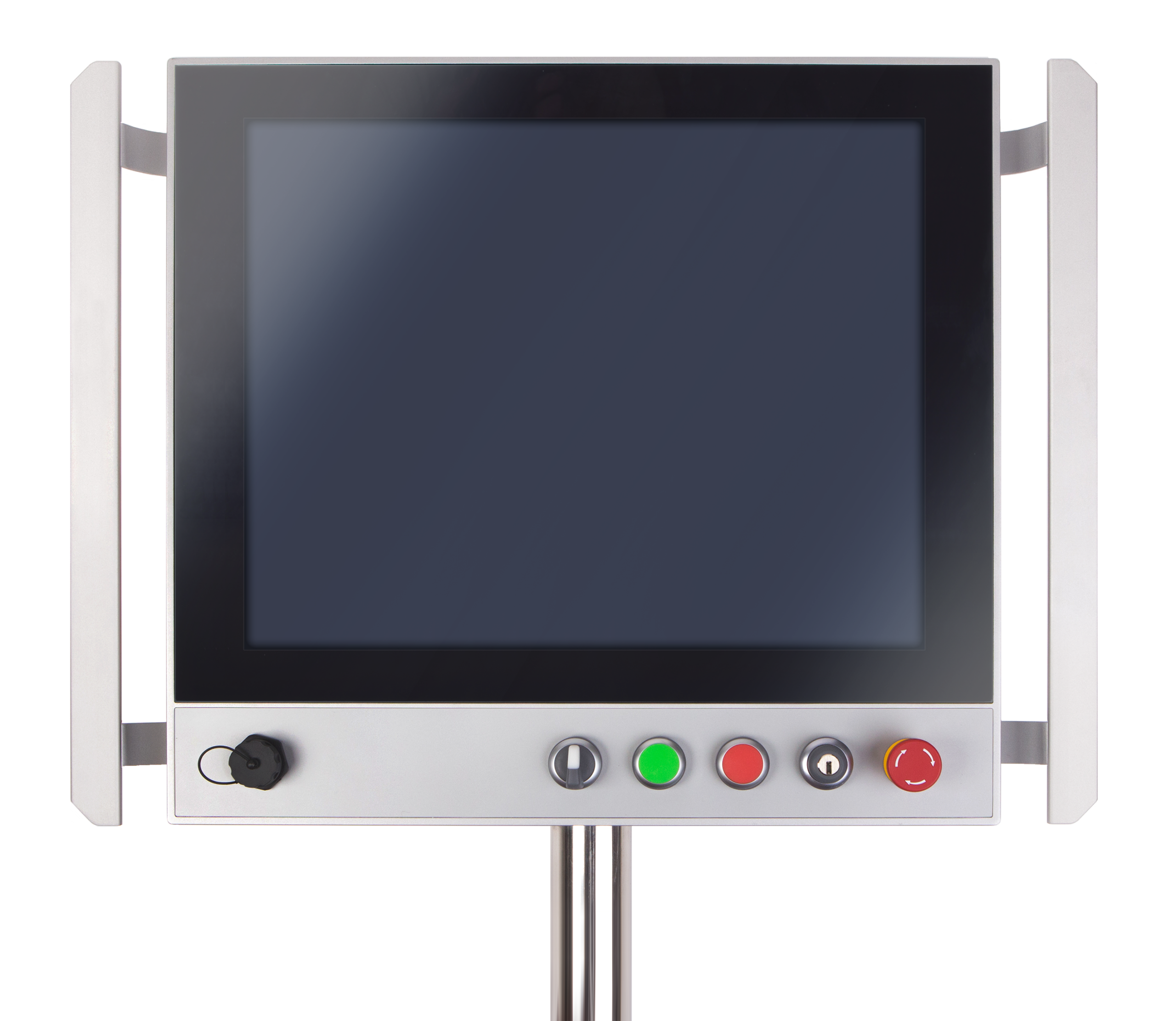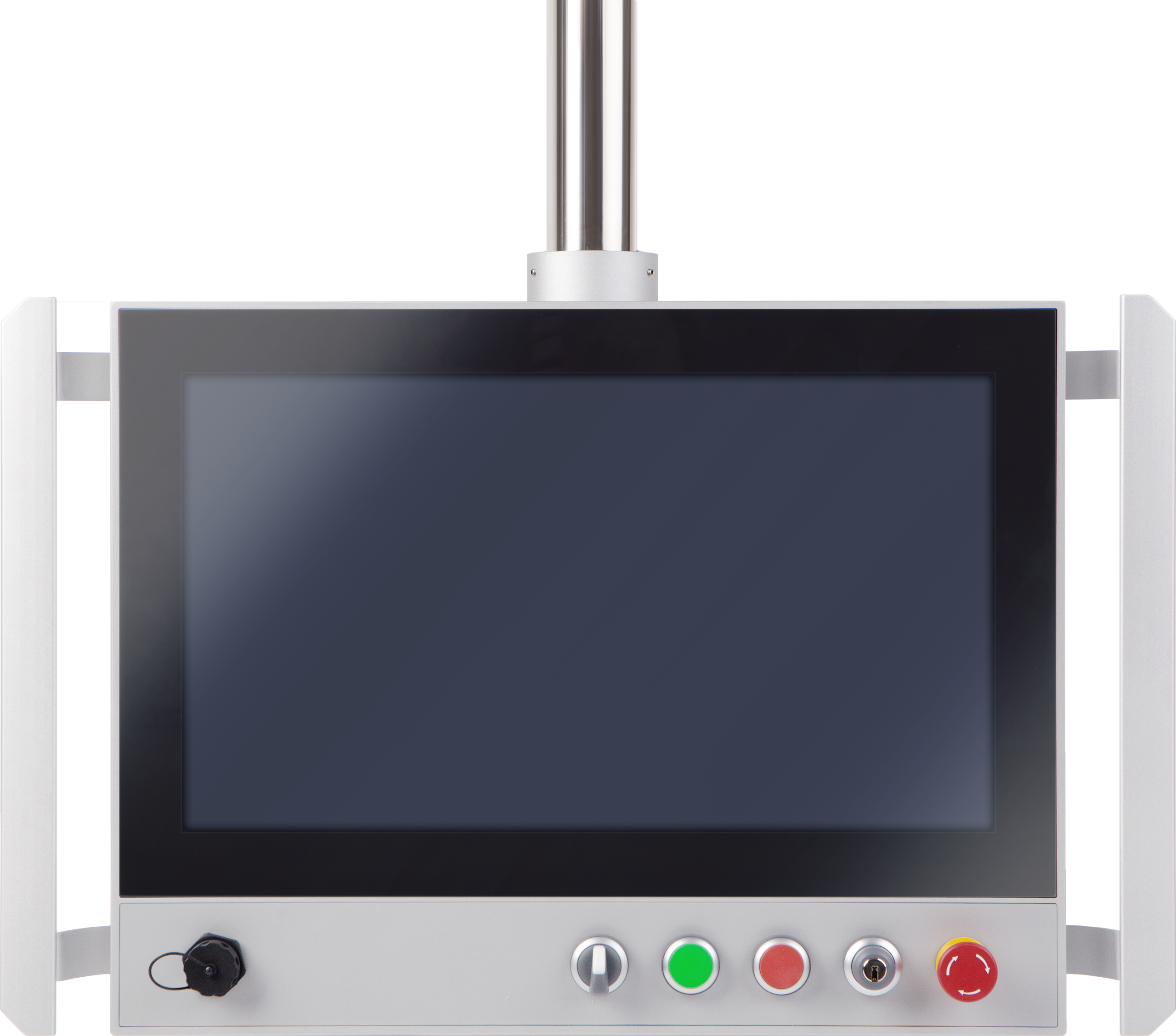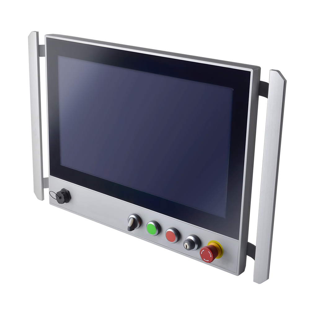 Below the screen sits a hard-wired button array. Emergency stop, key switch, selector and push buttons are configured to your specification. The layout can be changed from the front without disassembly.