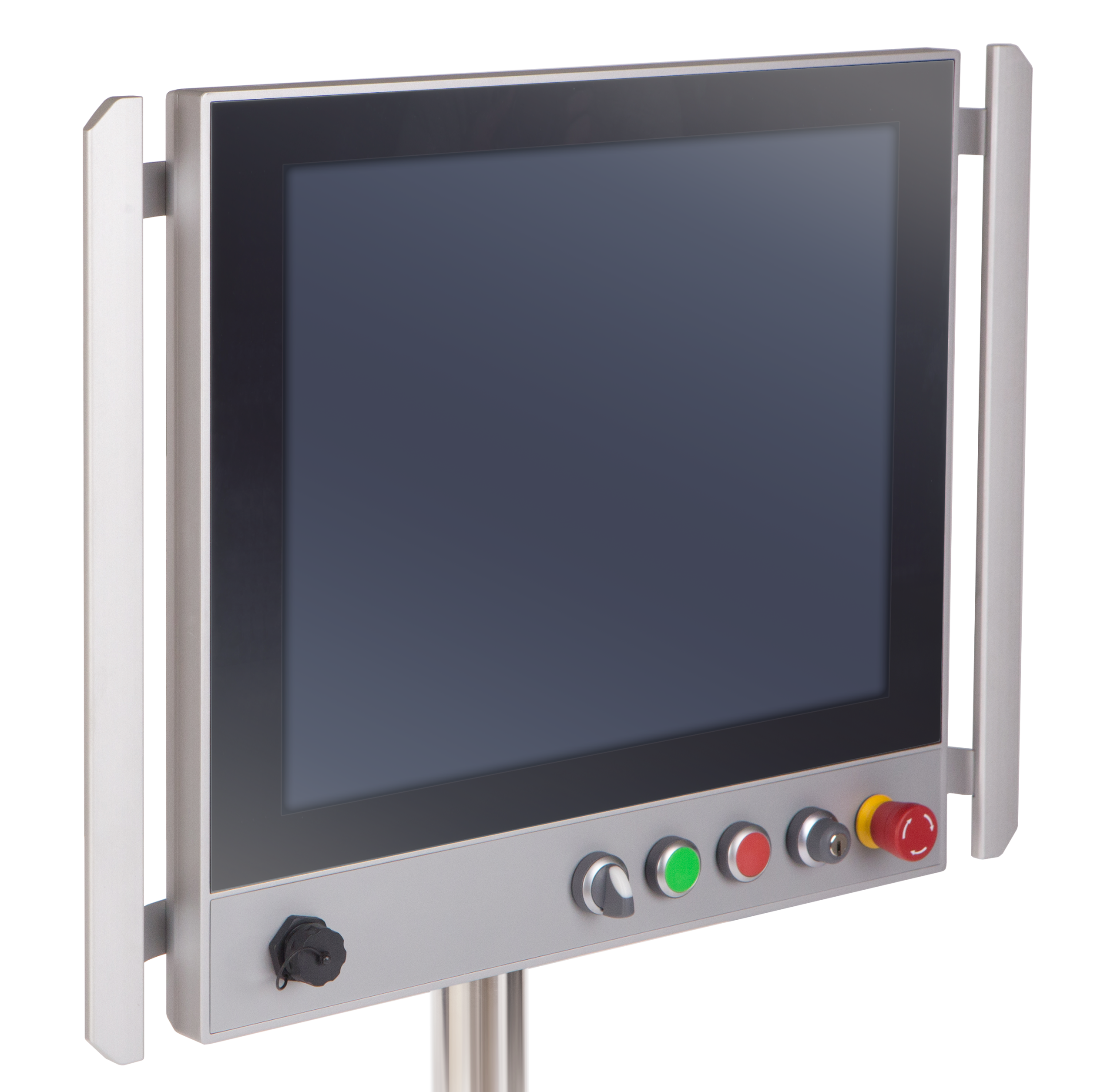 The compact 4:3 panel for replacing legacy operator stations or fitting into tight cabinet doors. Same IP65 sealing and modular button bank as the rest of the range.