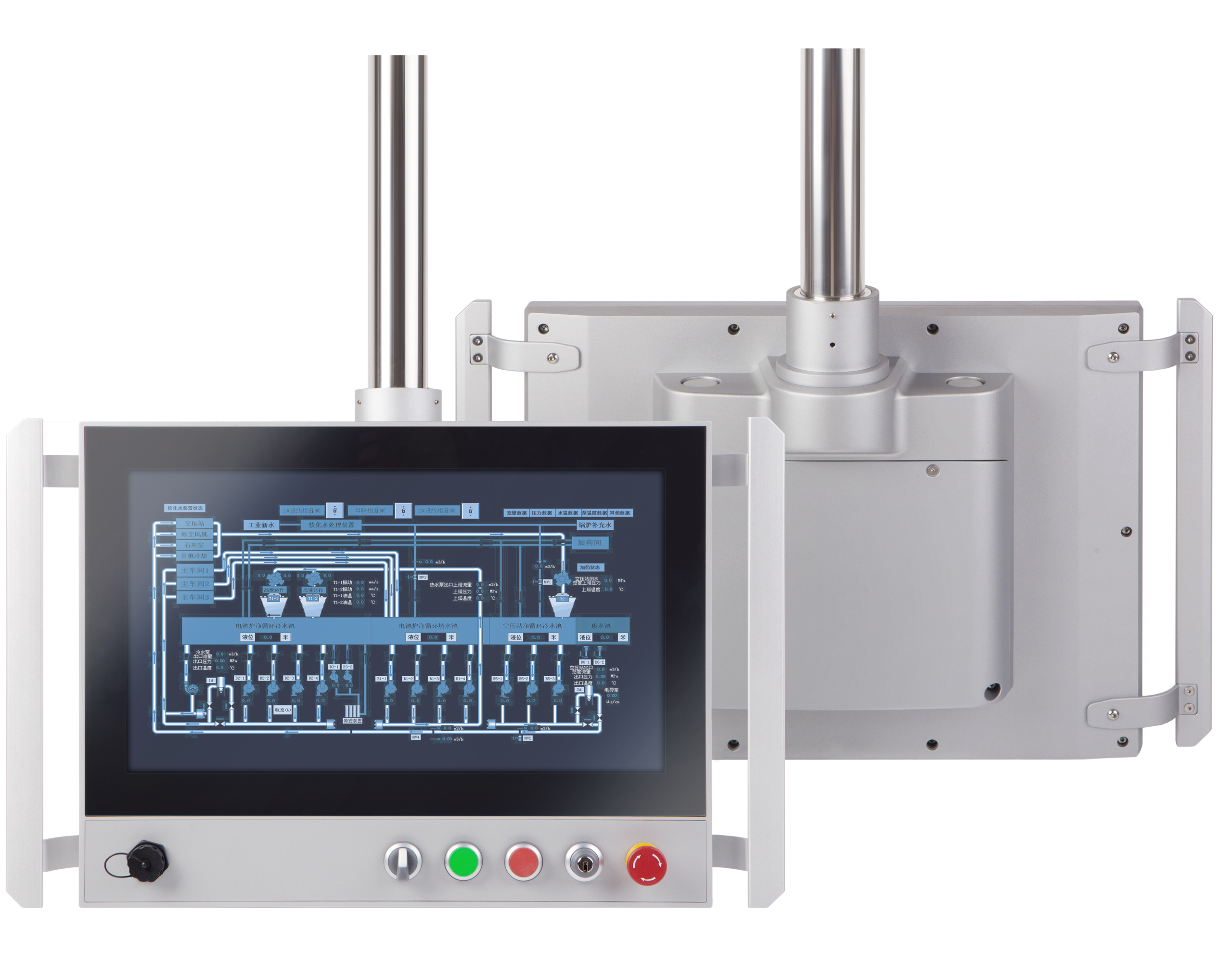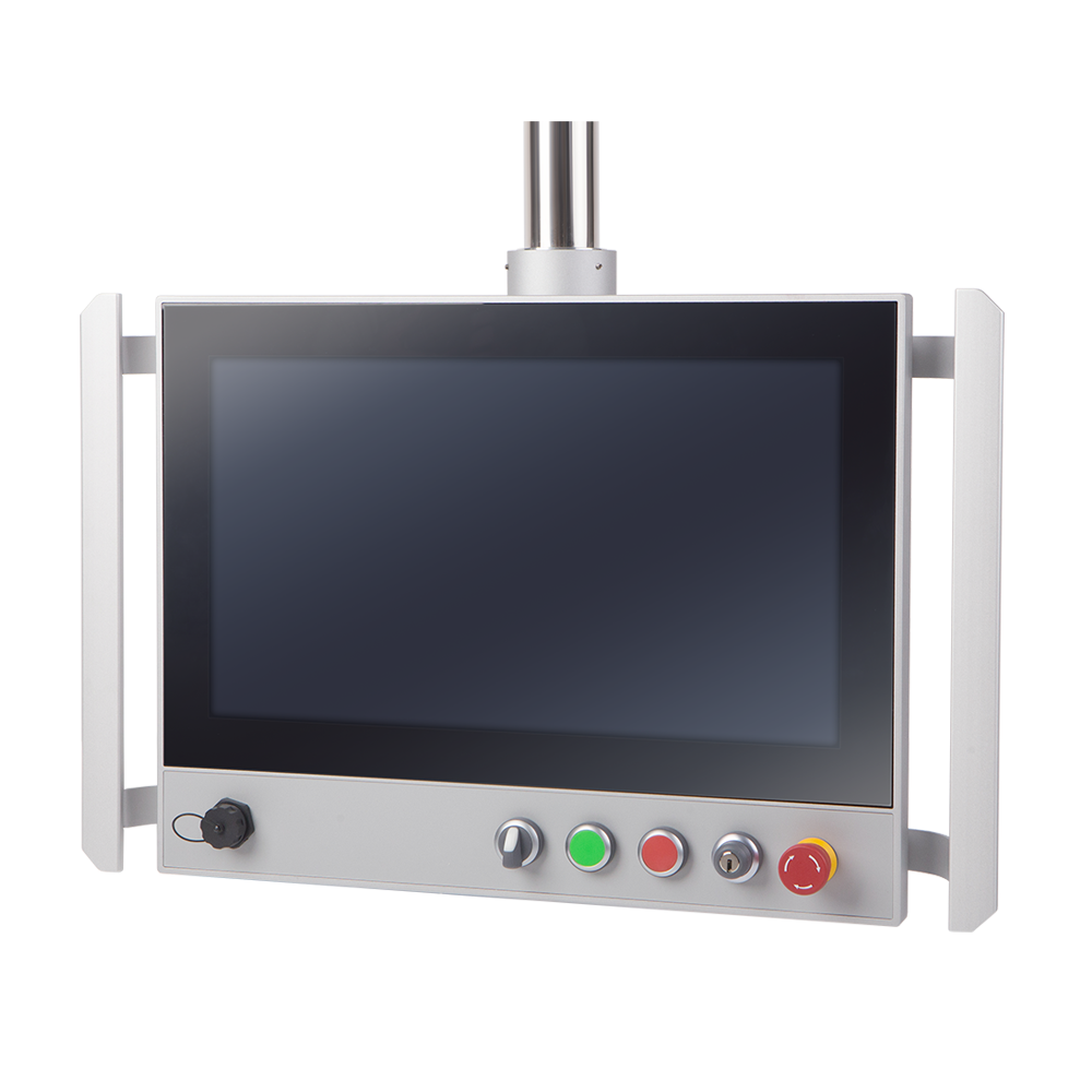 The swing arm repositions for different operators or working positions throughout the shift. Cable routing through the arm keeps the workspace clear. The arm-mount design lets one panel serve multiple zones around a machine, instead of fixing the screen to one spot the operator has to walk to.