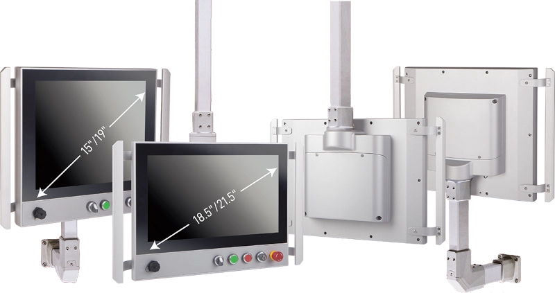 15″, 15.6″, 18.5″ and 21.5″ panels. Two resolution options at 15.6″ and 18.5″ sizes: WXGA (1366×768) or Full HD (1920×1080).
